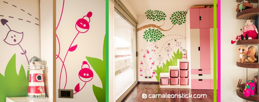 Ma il vero obiettivo era sfruttare lo spazio a disposizione e integrare gli adesivi con l’arredamento della cameretta: ecco così che i rami e le foglie invadono il soffitto, le libellule escono dall’armadio, i fiori nascono dalle prese elettriche e l’erba avvolge i gradini contenitori in cui Rosita tiene i suoi giochi.