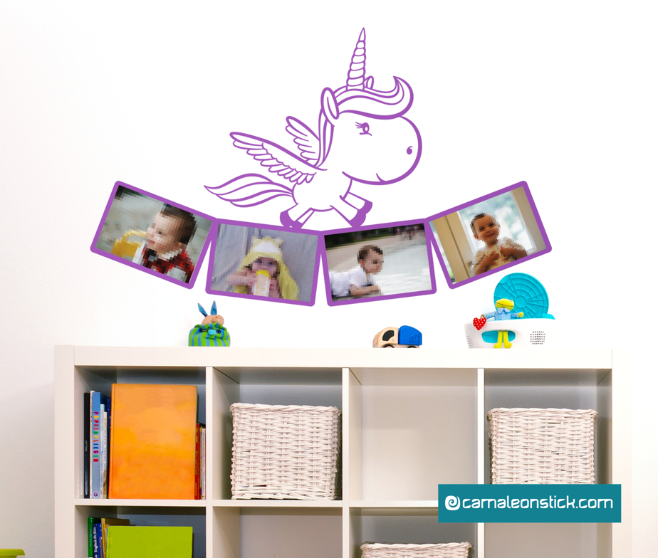 L'adesivo murale di un magico unicorno alato che mostra le foto del vostro bambino. Il Portafoto unicorno non può mancare nella cameretta ed è perfetto per arredare la parete sopra il lettino o il fasciatoio.