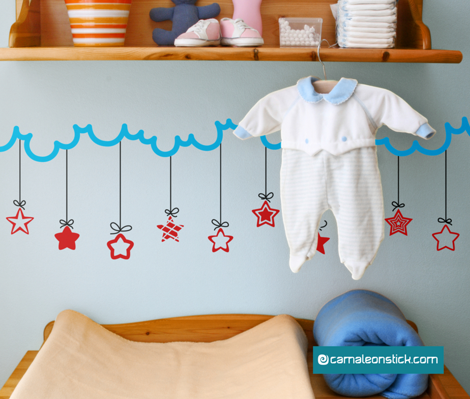 Decorate lo spazio del fasciatoio o la parete sopra il lettino con le meravigliose stelline dell’adesivo murale nuvole e stelle.