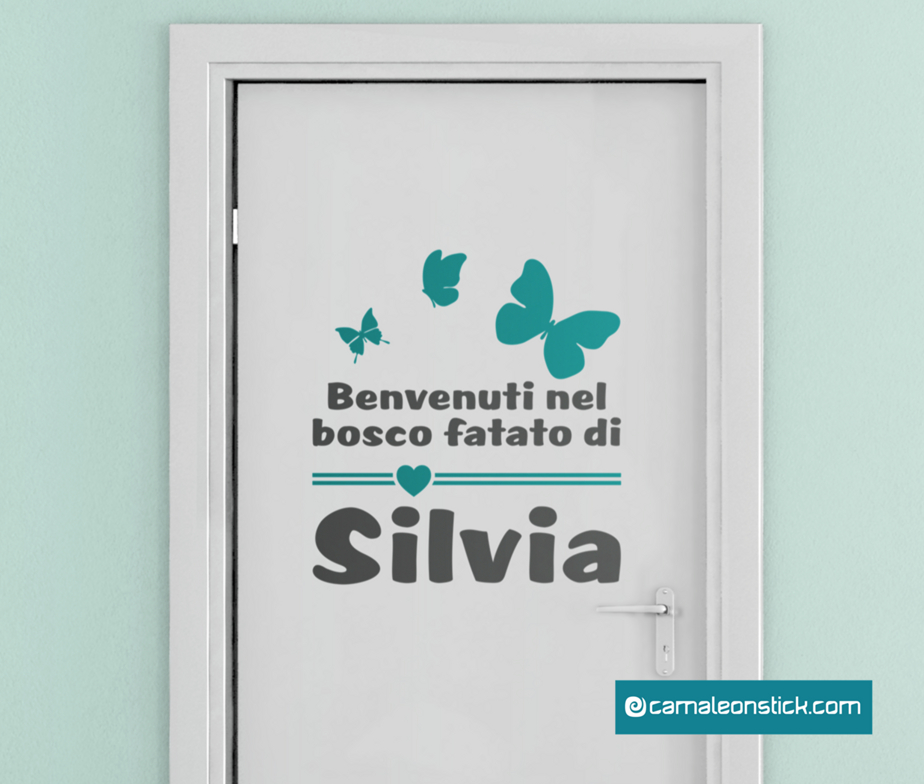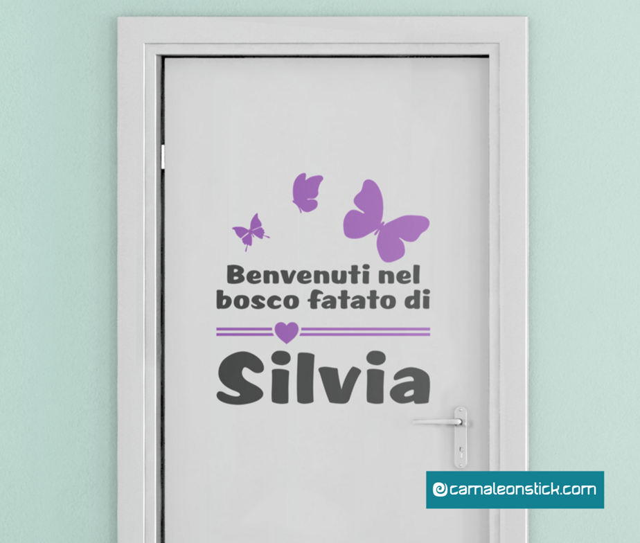 Decorate la porta della cameretta con l'adesivo murale Nome personalizzato bosco fatato.