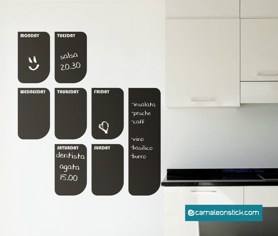 Le lavagne Camaleon sono speciali pellicole adesive sulle quali è possibile disegnare sia con normali gessetti colorati che con i pennarelli a gesso liquido. Potrete scrivere e facilmente cancellare tutte le volte che desiderate con un panno umido.
